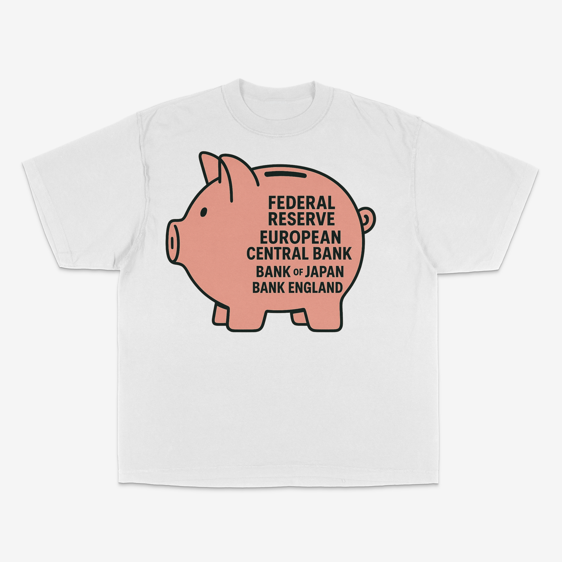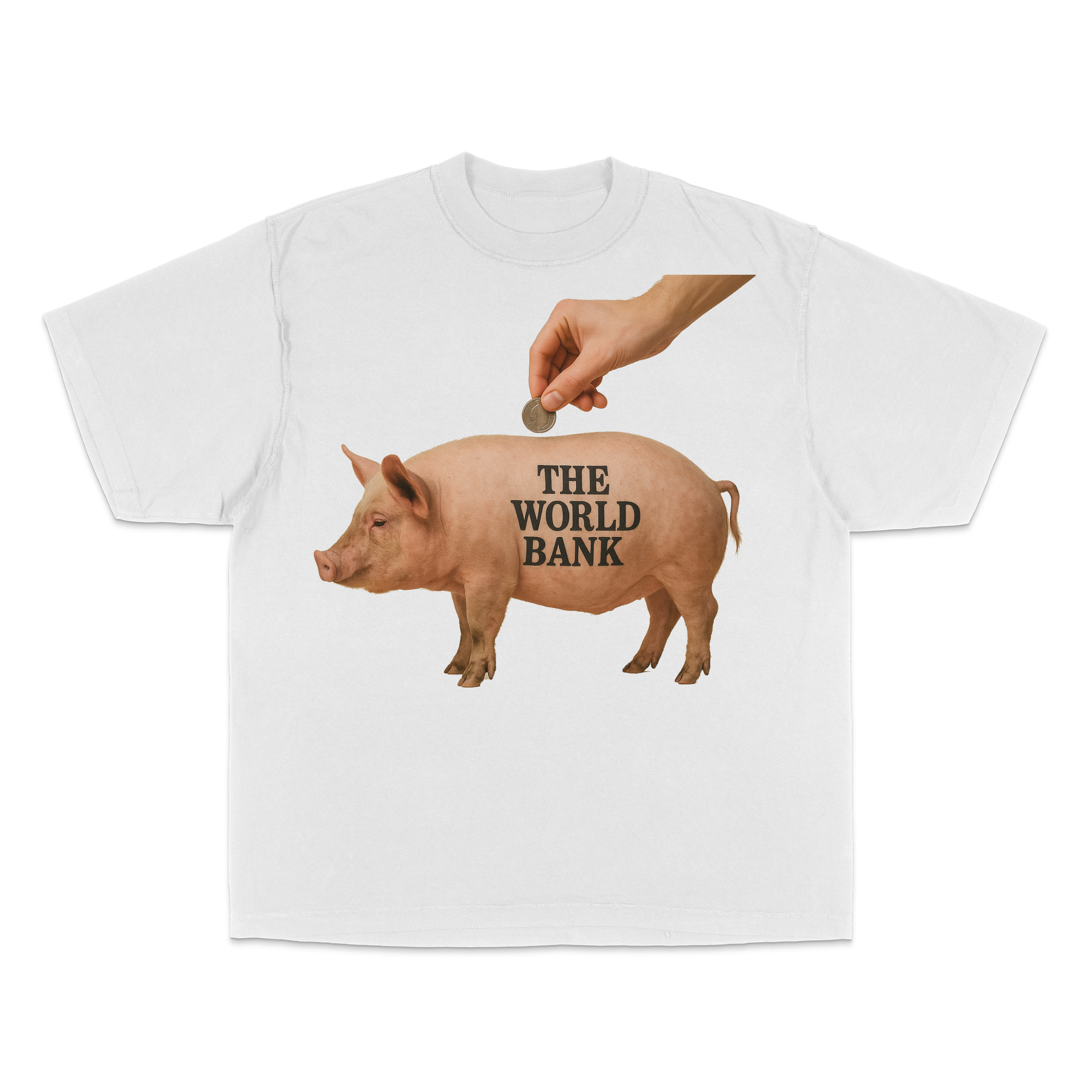 Trophs & Tropes - CMYK print questioning the piggish nature of world banks. 50 shirts minimum.