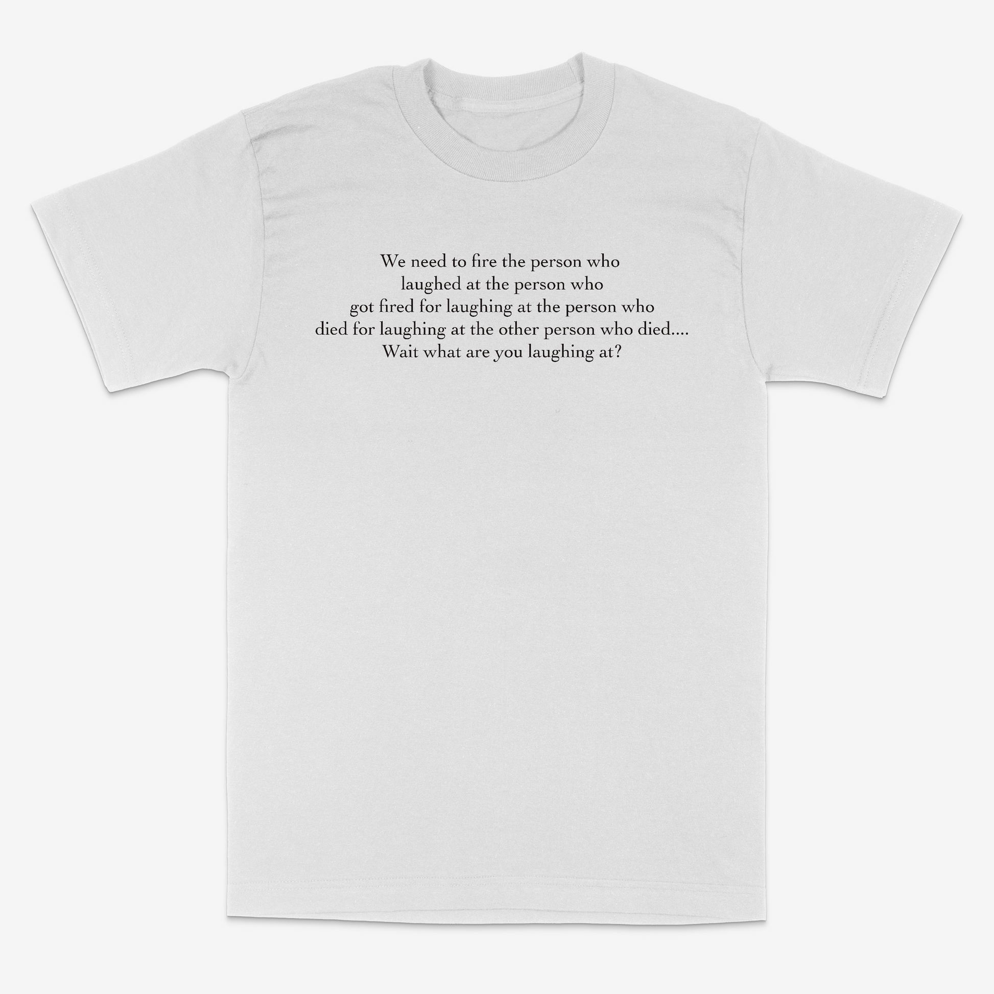 We need to fire the person who laughed at the person who got fired for laughing at the person who died for laughing at the other person who died....Wait what are you laughing at?